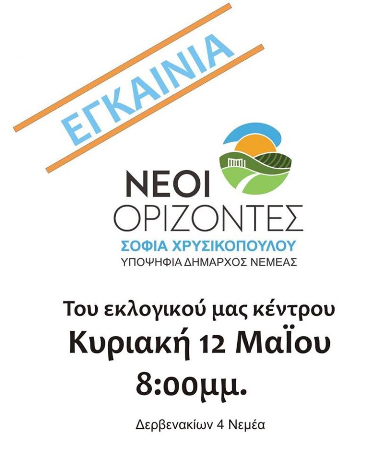 Την Κυριακή 12 Μαΐου και ώρα 20:00, θα πραγματοποιηθούν τα εγκαίνια του εκλογικού κέντρου της υποψήφιας Δημάρχου Νεμέας, Σοφίας Χρυσικοπούλου.